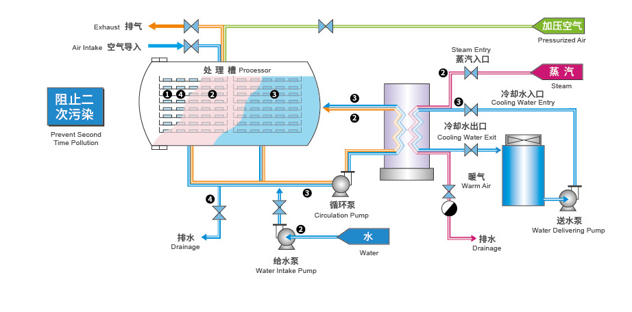 ? 間接加熱間接冷卻,冷卻用水與工藝用水不接觸,避免了食品的二次污染,無需使用水處理化學(xué)制劑,高溫短時間殺菌。